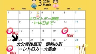 3月のカワサキベースの休日イベントのご案内です🐾予定が急に変更になる場合があります💦レトロ町の豊後高田市、観光では何度も行ってる町ですが出店側で今回お邪魔します!すごく楽しみなイベントです🚗29日はまだはっきりイベントか休日かはっきりしてな...
