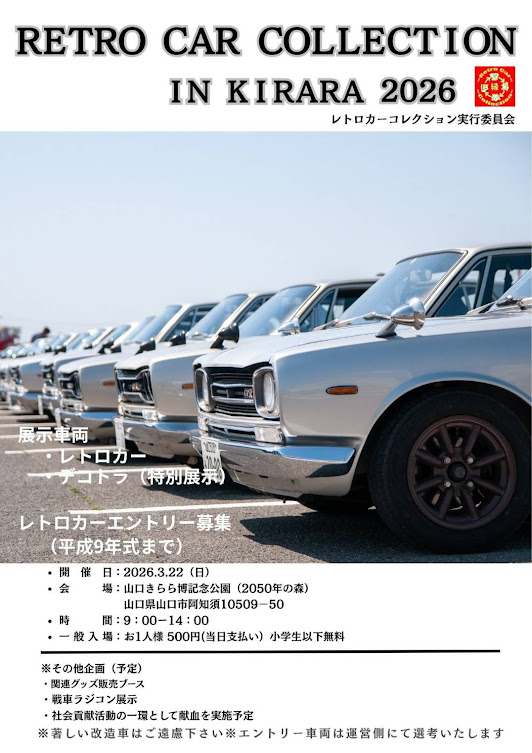 2026年3月22日、山口県山口市のきらら記念公園(2050年の森)で開催された「RETRO CAR COLLECTION in KIRARA 2026」に行ってきました。会場には平成9年式までのレトロカー・旧車・ネオクラシックカーが全国から集結し、ハコスカ・ケンメリ・旧車セダン・スポーツカー・軽旧車など多彩な車両が並び、旧車ファン・車好きにはたまらないイベントとなっていました。